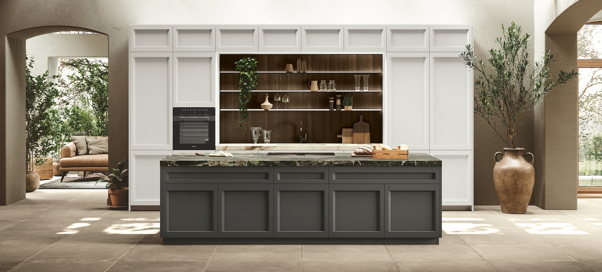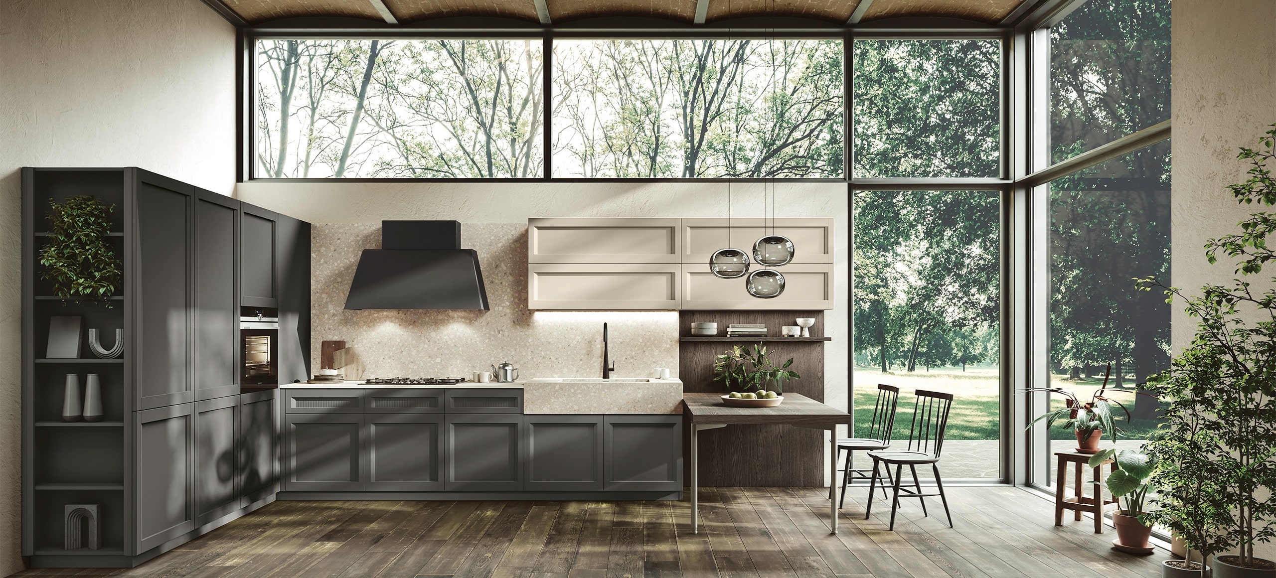 Un equilibrato gioco di volumi riesce a creare le atmosfere tipiche della tradizione, che si armonizzano con naturalezza a soluzioni estetiche contemporanee, semplici e razionali, di straordinaria flessibilità compositiva.