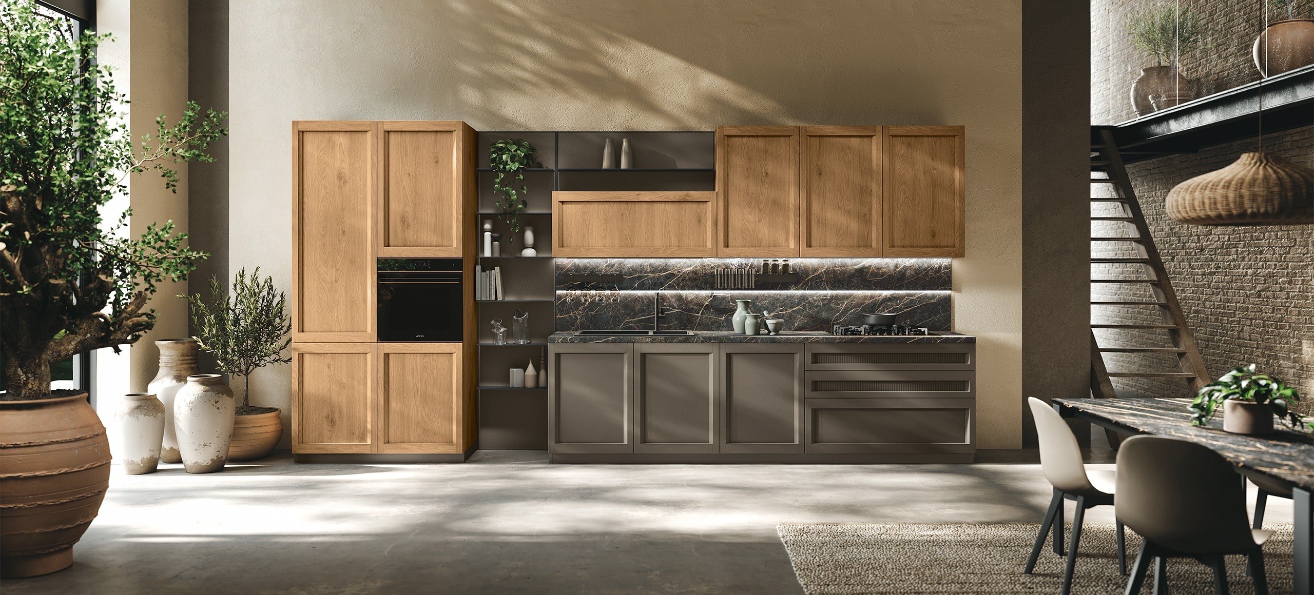 La caratteristica principale di Natural è rappresentata dalle ante impiallacciate, che esprimono tutta l’autenticità del vero legno in nuance pensate per donare calore all’ambiente.