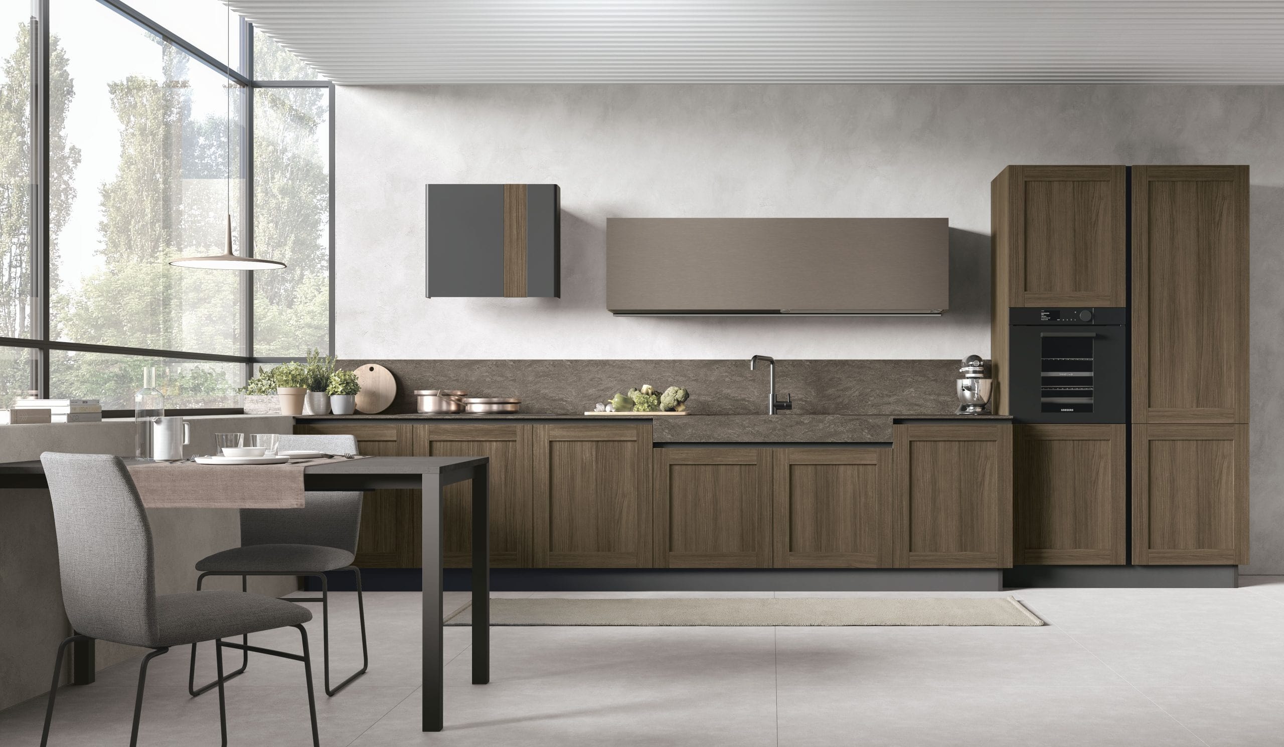 Caratteristica distintiva del modello è l’anta a telaio con bugna, che nel modello City assume uno stile creativo e non convenzionale. Un’estetica solida e decisa, una cucina capace di offrire sensazioni tattili e visive grazie alle sue finiture materiche.
