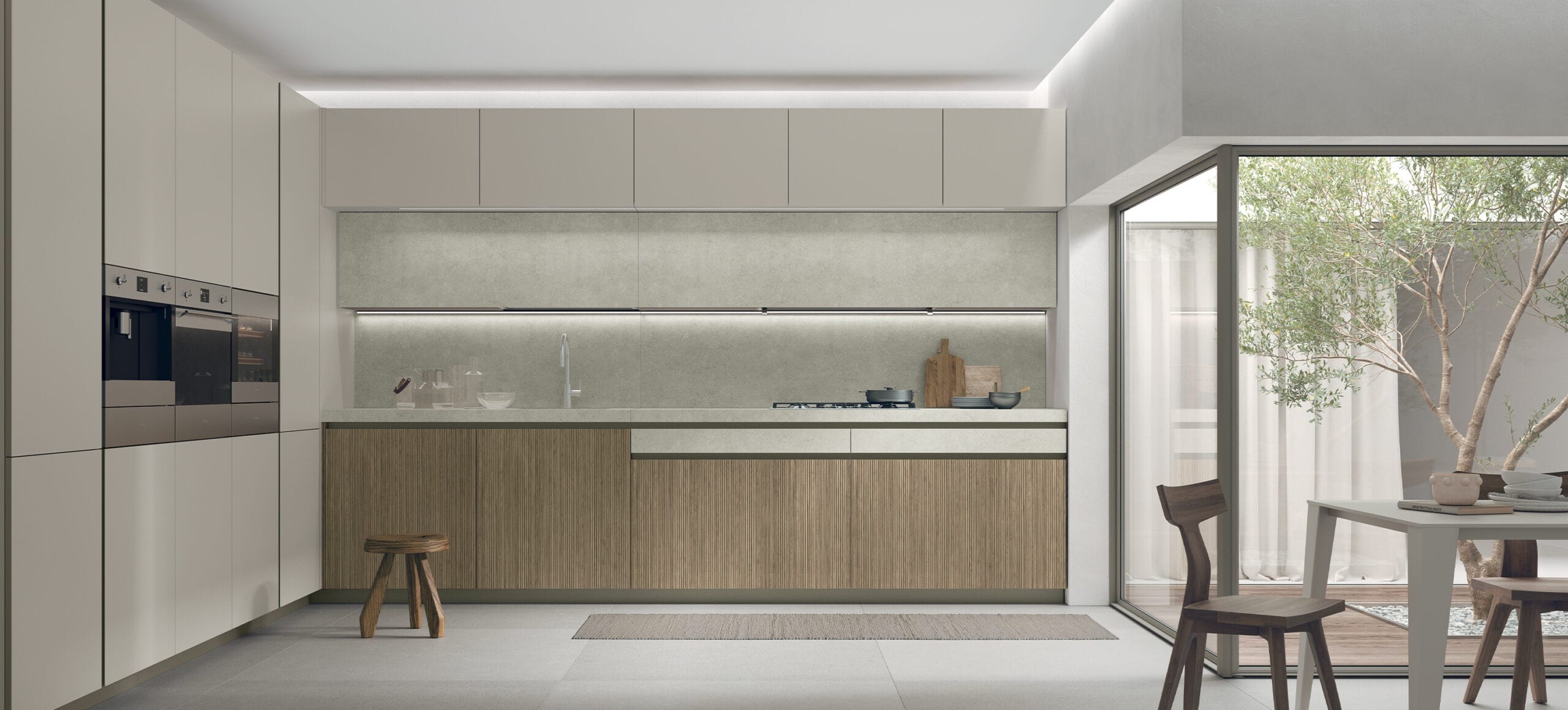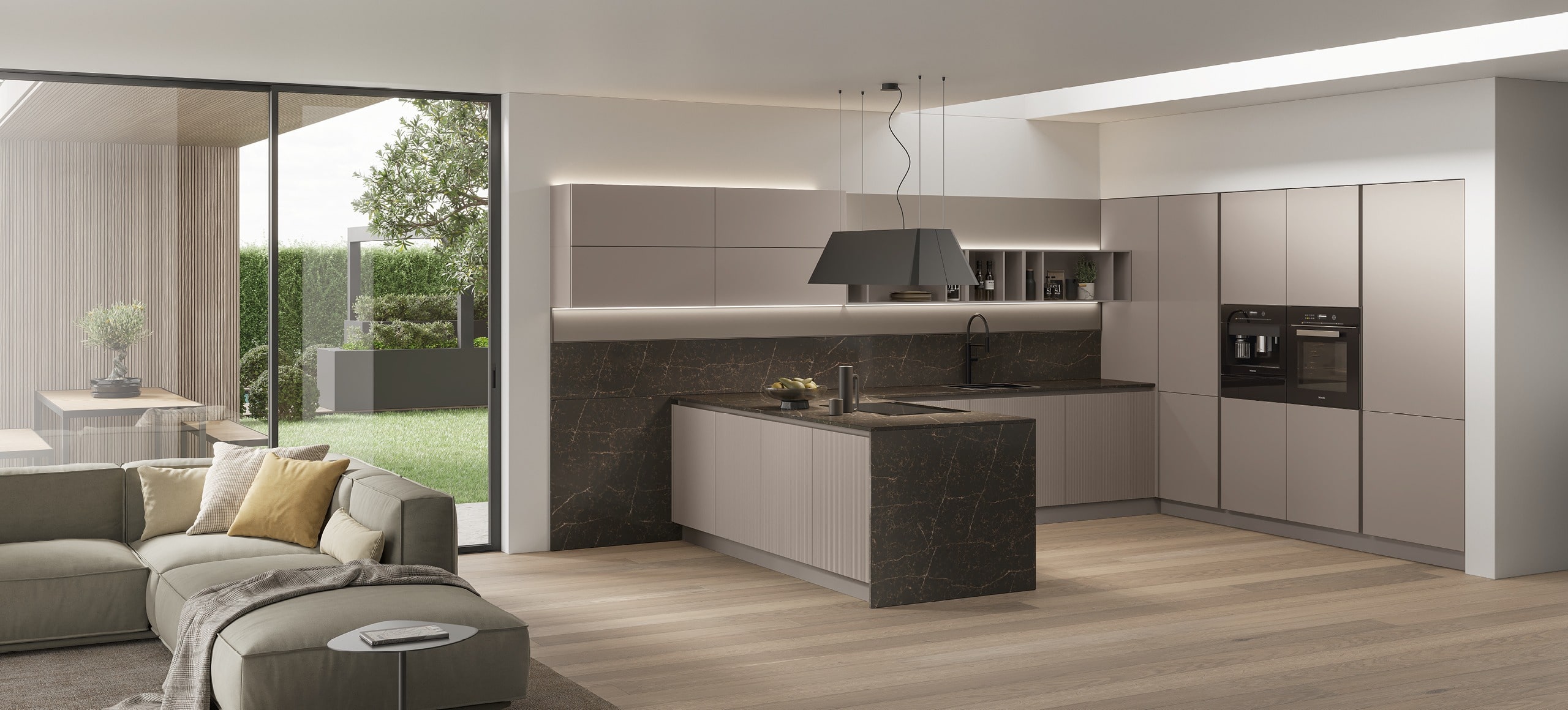 Pensata per un pubblico amante dello stile pulito e in grado di dare massimo risalto ai contrasti materici e cromatici delle finiture, Karma si distingue per l’anta con presa maniglia integrata che definisce e decora la cucina con tre tipologie di apertura: maniglia totale, maniglia parziale, contropresa maniglia, dettagli che contribuiscono a un look originale che al contempo garantisce massima funzionalità.