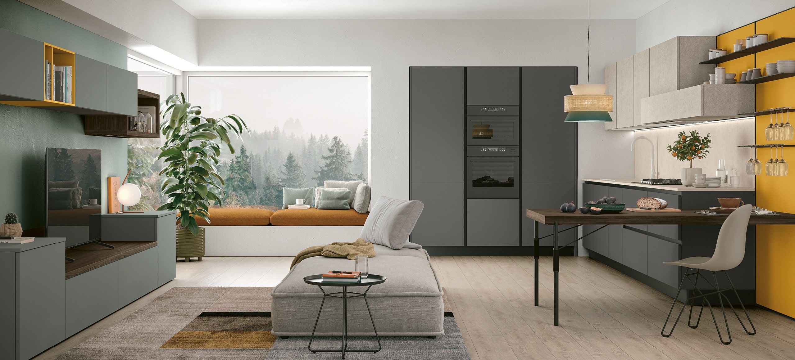 Virginia è progettata per creare mood accoglienti, che parlano di quotidianità familiare, grazie al calore delle ante in legno e alla ricercatezza dei particolari.
